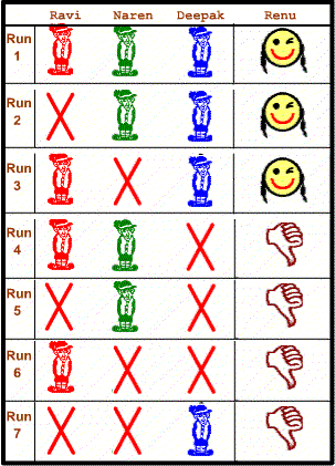 The data is building up, and we are all set to jump to wishful conclusions. We tell Deepak that she’s just playing games, and keep him back at home. Naren and I take a confident walk, eager to prove our theory of Renu playing games, but are in for a shock. Renu simply does not make an appearance. Less sure about ourselves, we tabulate this result too.